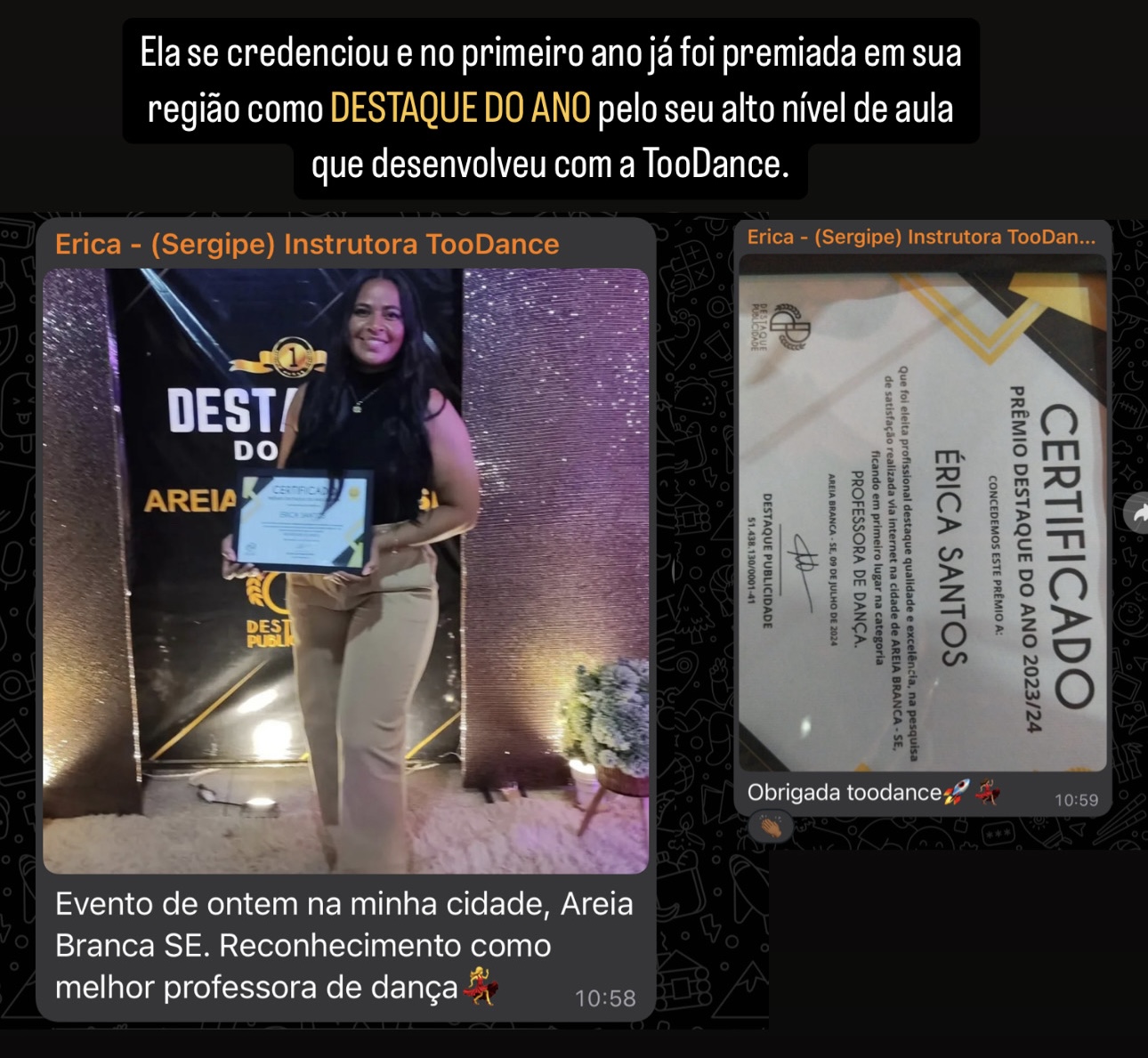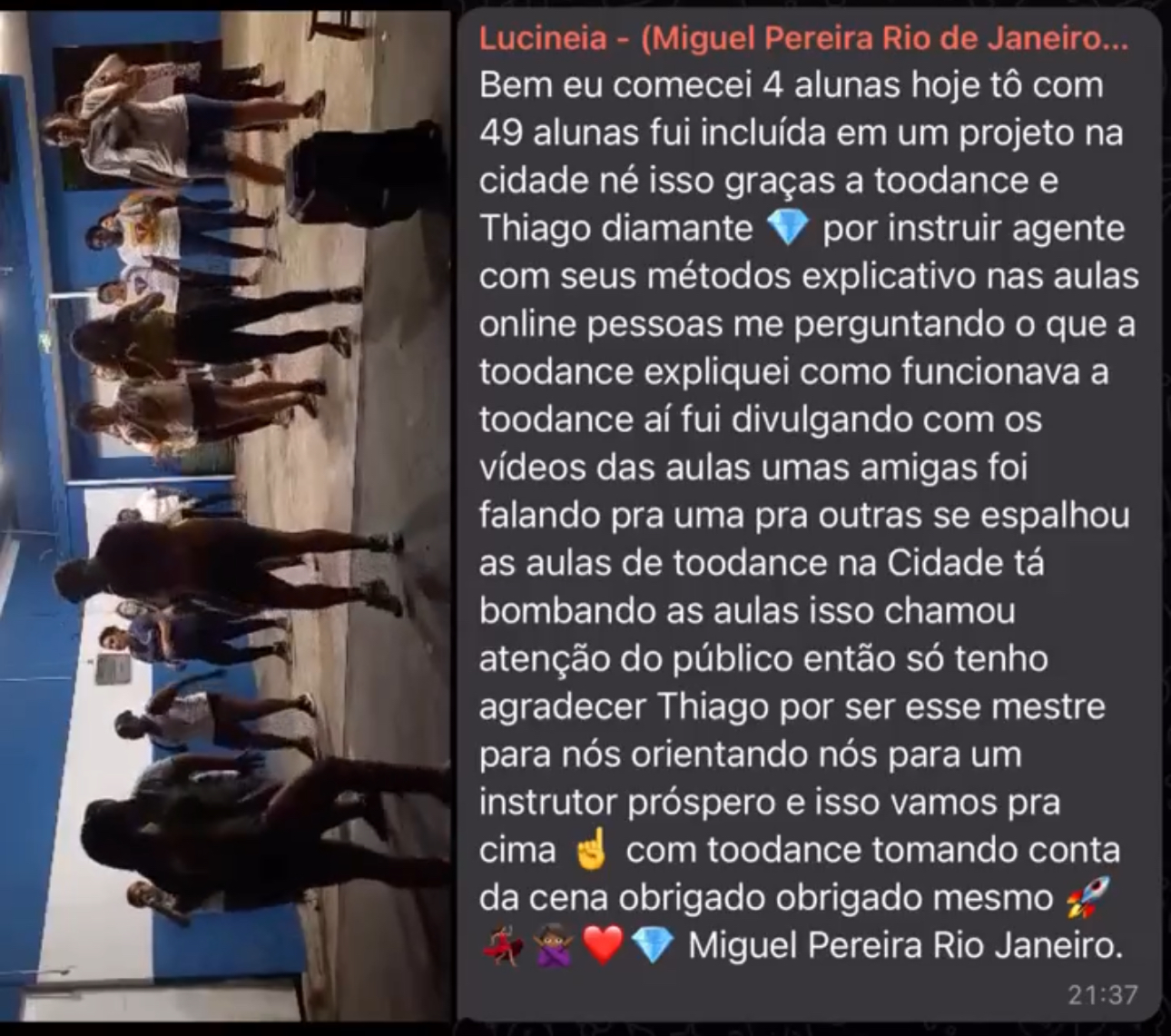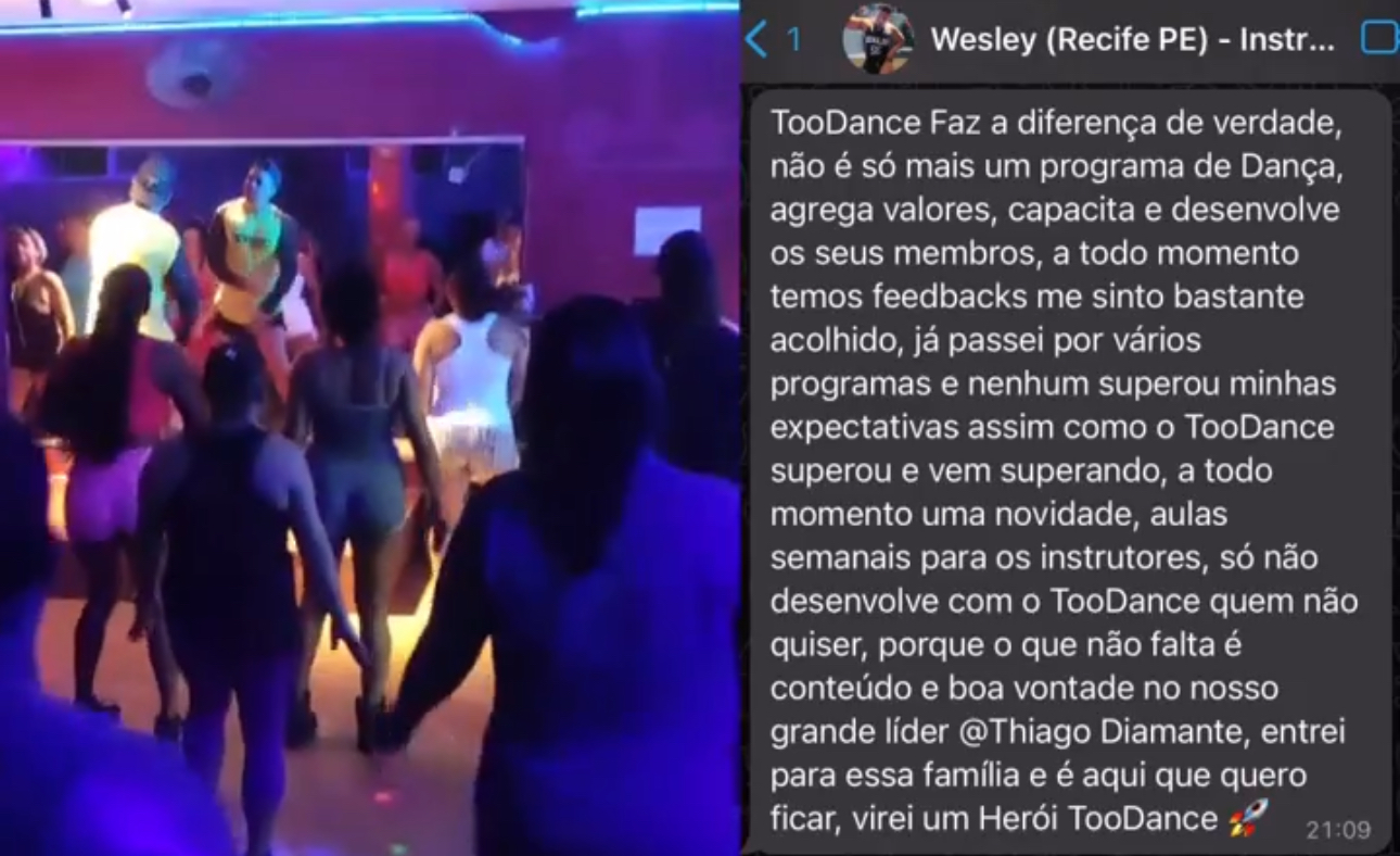 Thiago Diamante se transformou em um verdadeiro ícone na indústria da dança, destacando-se com suas aulas eletrizantes. Hoje, fatura múltiplos 6 dígitos mensais e é reconhecido como o Mestre dos Heróis da Dança, fundador da TooDance. Sua influência se estendeu além das fronteiras da dança, tendo formado mais de 4.000 heróis da dança, muitos dos quais receberam prêmios por serem destaque do ano em suas respectivas regiões e desfrutam de carreiras prósperas. A sua comunidade TooDance possui cerca de 45.000 alunos no Brasil. Thiago é uma inspiração para aqueles que buscam superar adversidades e transformar suas paixões em sucesso duradouro.